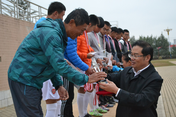 12月2日,为期近40天的bat365第一届“文烈杯”学生足球赛落下帷幕,下午,闭幕式在学校运动场举行。学校党委副书记、足球赛组委会主任王志刚出席并为获奖队伍颁奖。