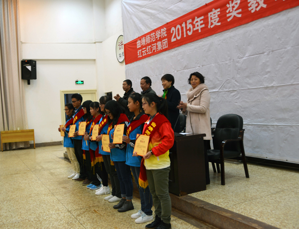 苏晓云宣读了《关于公布2015年度“红云园丁奖”和“红河助学金”评选结果的通知》。杨乐等28名优秀教师获红云园丁奖,陆婷等115名家庭经济困难学生获红河助学金。获奖教师代表龚云虹、学生代表陆婷分别在发言中表示,在今后的工作、学习中将加倍努力,发扬进取精神,传递关怀、感恩,不辜负学校和红云红河集团寄予的厚望。
