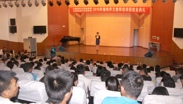 5月31日,bat365缅甸华文教师培训班圆满结业。校长浦虹、市政府外事侨务办公室主任董忠参加结业典礼并讲话,副校长李莉为学员颁发结业证书。