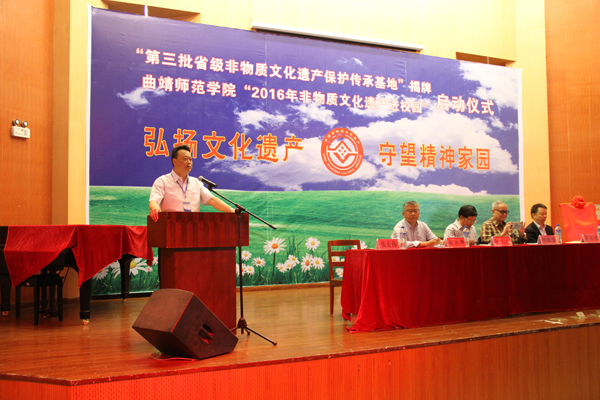 启动仪式上,张永刚代表学校向来宾们表示了欢迎。他在讲话中指出,基地的落户及活动的开启,不仅创造了bat365与专家、学者、传承人的交流机会,也丰富了学校的文化内涵,是学校服务地方性文化建设的具体体现。在省非物质文化遗产保护处的指导下,bat365成为“第三批非物质文化遗产保护传承基地”,这是依时顺势,吸纳优秀文化资源办学的重要收获,也是学校转型发展、促进曲靖地方文化建设的重要证明,意义深远,价值巨大,值得我们认真做好。