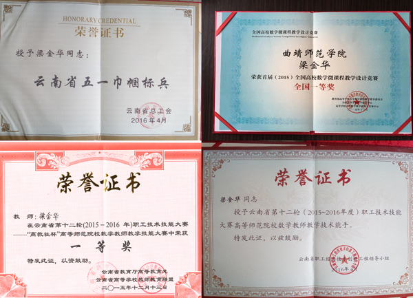 为提高课堂教学质量,她注重学生学情分析,针对不同专业进行教学设计,收到了明显成效。在她参与的各类教学竞赛中展示了自己过硬的教学水平和优良的教学业绩。2014年12月,她首次参加学校举行的青年教师微课大赛,获得理科组二等奖的好成绩。2015年4月,她参加“云南省“高教社杯”高等师范院校数学教师教学技能大赛,斩获一等奖;同年4年,她参加“全国高等学校数学微课教学设计大赛,勇夺西南赛区特等奖,并作为云南省唯一一名选手进入全国决赛,在8月举行的全国总决赛中,她果然不负众望,捧回“一等奖”,为云南教育争了光。今年4月,她先后被授予“云南省第十二轮职工技能大赛高等师范院校数学教师教学技术能手”和“云南省五一巾帼标兵” 称号。
