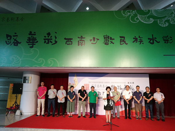 李莉在致辞中说:山城重庆四面环山,城市傍水依山,历史悠久,文化底蕴深厚。各民族文化交相辉映,特色鲜明,民族风情独特,是南方丝绸之路的一块绚丽的瑰宝。在各位领导的关心和各位艺术家们的鼎力支持下,今天《丝路华彩——西南少数民族水彩艺术展》在美丽的重庆和大家见面了,这既是一次优秀作品的集中展现,也是一次水彩艺术的学习、传播和交流。她指出,参加此次“巡展”的7位水彩画家是曾参加过bat3652014年组织的国家艺术基金西南少数民族水彩画人才培养项目的重庆水彩画家,他们毕业于四川美术学院,在国家级的水彩画大展中均有突出的表现,是川美培养出来的实力派画家和青年才俊,是西南水彩的未来之星。