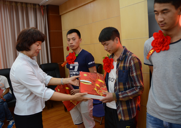 欢送会上,李国疆和李莉一同为入伍学生佩戴“光荣花”,赠送学校纪念品,并合影留念。