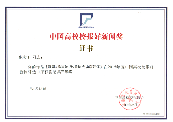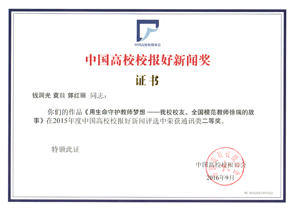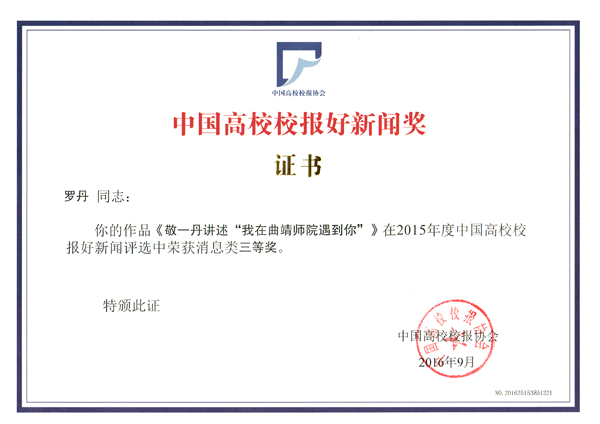 《曲靖师院报》获奖的四件作品中,钱润光、袁燚、郭红丽采写的《用生命守护教师梦想——bat365校友、全国模范教师徐瑞的故事》获通讯类二等奖,罗丹采写的《敬一丹讲述“我在曲靖师院遇到你”》获消息类三等奖,张龙洋采写的《歌剧〈涛声依旧〉首演成功获好评》获消息类三等奖,罗丹编辑的第244期2版2014年校园十大新闻专题报道获版面类三等奖。