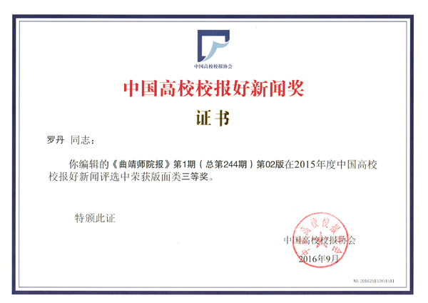 近日,中国高校校报好新闻2015年度评选揭晓,《曲靖师院报》荣获一个二等奖、三个三等奖。