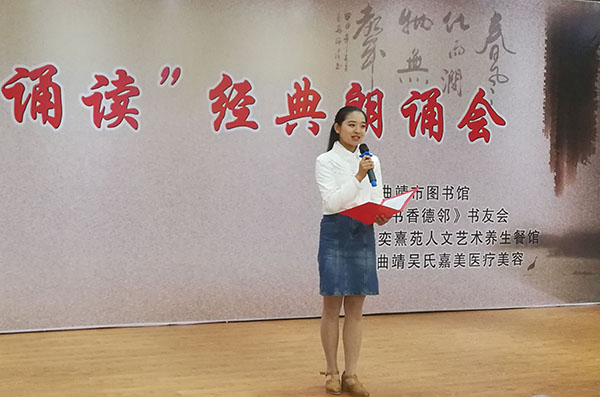 朗读会上,来自曲靖市工商行政管理局、曲靖市图书馆、曲靖经开区等单位的朗诵爱好者们演绎了《来看此花时的你》、《春》、《藏书与读书》、《我们的祖先叫炎黄》等9篇脍炙人口的经典诗文,展现了名家名篇的独特魅力,并有念舞《鸿雁》、风·雅·颂《千年风雅》等节目的精彩演出。