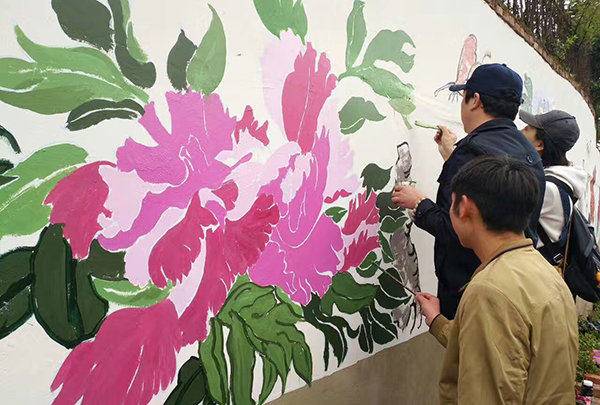 美术学院青年志愿者为牡丹小镇绘制墙体壁画