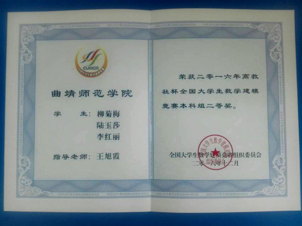 数学与统计学院派出数支队伍参赛,通过师生共同努力,取得参赛以来最好成绩。由王旭霞老师指导的柳菊梅、陆玉莎、李红丽三名学生组成的小组获得了全国二等奖1项。此外,由其他老师指导的学生小组获得云南赛区一等奖3项,二等奖6项,三等奖7项。