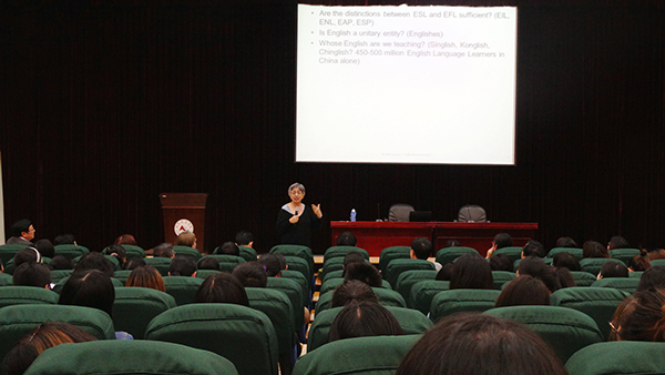 2017年4月25日,来自美国印第安纳大学的Faridah Pawan教授在bat365图书馆一楼报告厅作了题为《从鱼到龙:英语作为外语和二语教师的专业素养和职业化研究》的讲座。讲座由外国语学院院长朱宏华主持,校长浦虹及外国语学院师生到场聆听讲座。