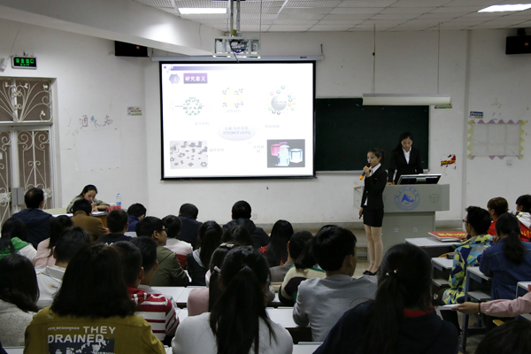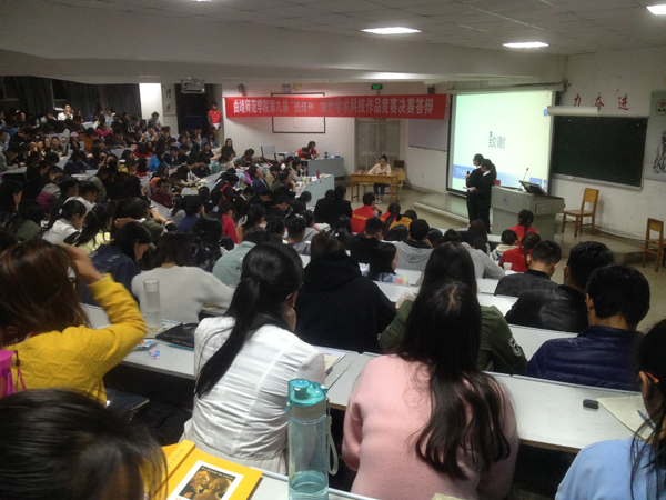 决赛以现场答辩的形式展开,分为作品陈述和现场问答两个环节。参赛选手在5分钟的时间内利用图表数据、文字说明,就作品的创新点、研究背景、主要内容、社会经济价值等方面进行了条理清晰的阐述,评委结合作品文本和选手现场答辩情况有针对性的提问,与选手进行激烈问辩。答辩现场气氛紧张而又活跃,精彩提问和答辩赢得了现场师生的阵阵掌声。