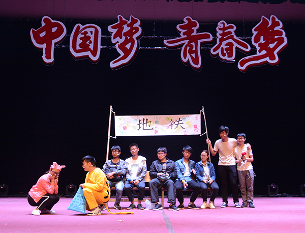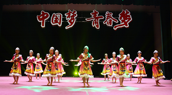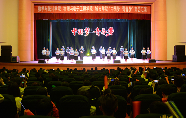 当夜幕降临时,由数学与统计学院、物理与电子工程学院、城市学院联合举办的文艺汇演在学生会堂举行,动感十足的B-box和街舞、婉转悠扬的歌曲、优雅曼妙的舞蹈、诙谐幽默的小品等精彩节目为同学们带来了一场美妙绝伦的视听盛宴。整场晚会精彩不断,高潮迭起,欢呼声一浪高过一浪。绚丽多彩的《民族时装秀》为今天的活动画上了圆满的句号。