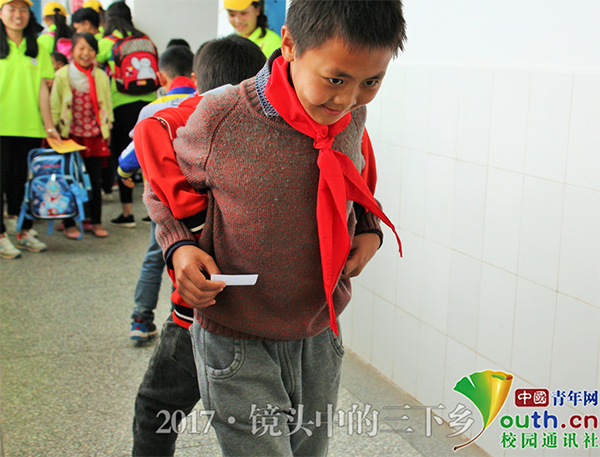 爱心结对心连心,在亮泉小学志愿者们与留守儿童进行一对一爱心帮扶。志愿者在给小朋友的卡片上留下自己的名字、联系方式,让小朋友在学习和生活中遇到问题的时候可以寻找哥哥姐姐们的帮助,希望孩子们能健康成长,开心快乐;同样,小朋友在写给志愿者的卡片里留下了自己的姓名和家庭住址,并表示会努力学习,以哥哥姐姐为榜样,快乐成长。小小的卡片将志愿者与小朋友紧紧连在一起,大手牵小手,成长路上不孤单。中国青年网通讯员朱勋迪 摄