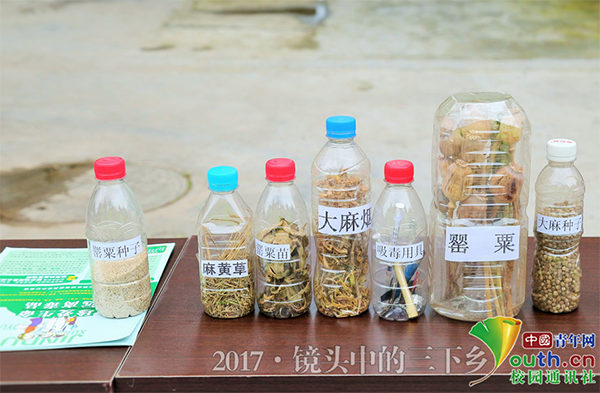 抵制毒品,从源头做起,从身边做起。罂粟、大麻等作为毒品的主要原料,也就是在农村所俗称的“大烟”、“麻子”,大家都很熟悉,很多人还会用作调味品、入药、食用等,却不知道这是毒品萃取的原材料,虽然未加工,但长时间服用还是会上瘾,并且对身体也有很大伤害。并且我国法律规定种植罂粟、大麻等属于违法行为,视种植数量等可判刑。禁毒防艾要从源头做起,把毒品遏制在摇篮中。中国青年网通讯员杨凤姣 摄