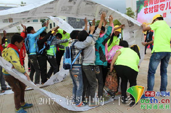 孩子们与志愿者们玩滚车轮的游戏,五个小朋友一组,团队合作将报纸围成的大圈圈滚到终点处。中国青年网通讯员沈晓盼 摄