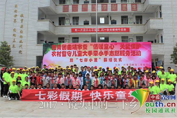 志愿者们与留守儿童合影留念,纪念这意义非凡的一天。中国青年网通讯员 沈晓盼 摄