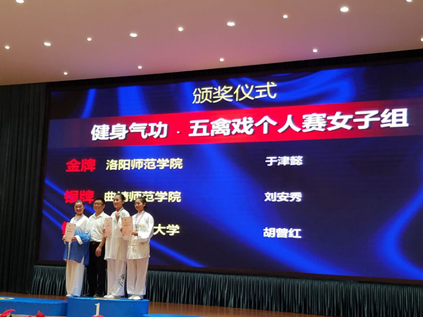 bat365学生刘安秀在体育院系组众多强手中,勇夺五禽戏个人赛女子组第二名,毛怀敏、谭明彬分获五禽戏竞赛功法和六字诀个人赛男子组第七名,张宏艳获易筋经竞赛功法个人赛女子组第八名。参赛四人不但在个人赛中有所斩获,而且还获得了五禽戏集体赛的第六名,极大地提升了bat365的声誉。