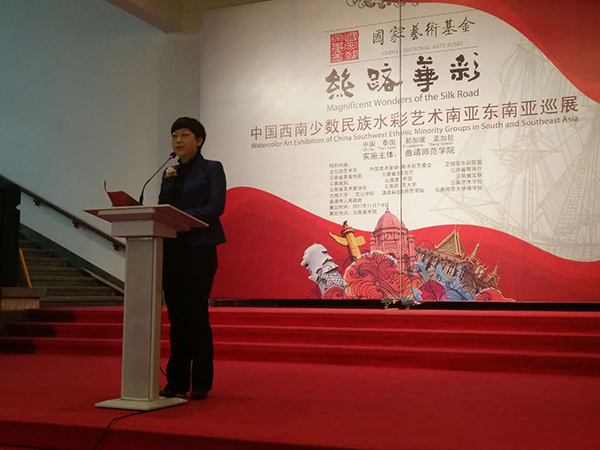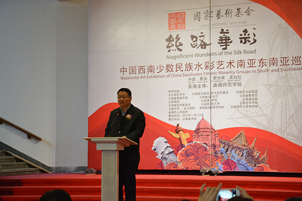 浦虹在致辞中说,在文化部和国家艺术基金的关心支持下,bat365一共获得了5项国家艺术基金的资助,这次又获批进行《丝路华彩》南亚、东南亚的海上丝绸之路巡展。这是国家对西南少数民族水彩艺术的鼓励和扶持,也是bat365长期坚持艺术教育结出的硕果。艺术是没有国界的,《丝路华彩》通过展览“讲述着中国的故事,传播着中国的声音”,响应国家“一带一路”倡议,分享南亚、东南亚国家之间艺术家水彩艺术创作的最新成果,文明互鉴,传递友谊,传播大美,谱写海上丝绸之路新篇章。