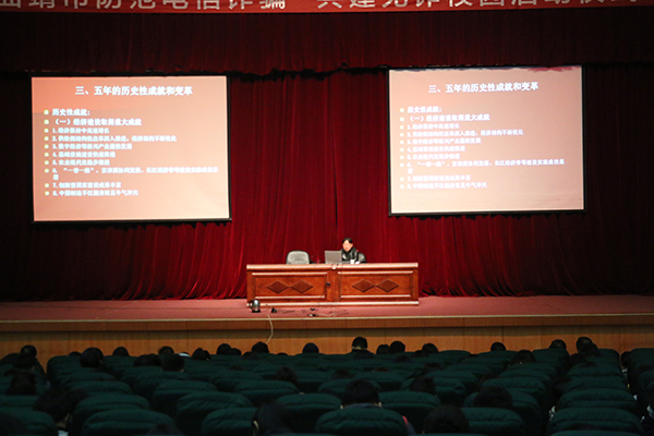 臧国书教授以“深入学习十九大精神,准确领会精神实质和内涵”为主题进行宣讲,他围绕党的十九大主题和最重要成果、党的十八大以来面临的新形势、五年的历史性成就和变革、习近平新时代中国特色社会主义思想的理论渊源、习近平新时代中国特色社会主义思想的重大意义、习近平新时代中国特色社会主义思想的丰富内涵、新时代坚持和发展中国特色社会主义的基本方略、贯彻落实十九大精神、谱写曲靖跨越发展新篇章、科技工作者学习十九大精神——争抓实干建科技强市等方面,对党的十九大精神进行了深入浅出的解读。