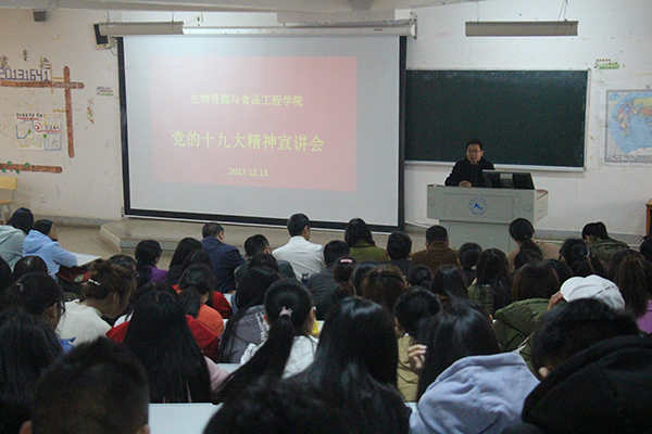 12月13日下午,党委副书记陆选荣为生物资源与食品工程学院师生宣讲党的十九大精神,宣讲会在第一理学楼C212举行,学院党总支书记施晓东主持。