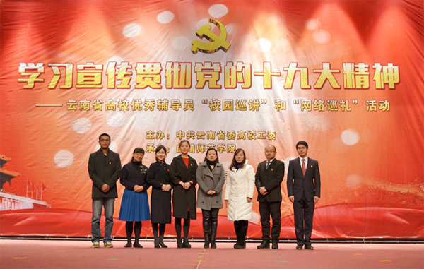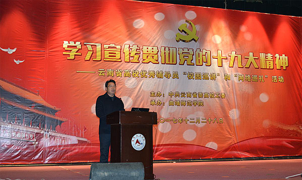 12月28日,由中共云南省委高校工委主办,云南省8所高校辅导员发展研究中心承办,全省各高校协办的“学习宣传贯彻党的十九大精神——云南省高校优秀辅导员校园巡讲和网络巡礼活动”校园巡讲团第五组报告在bat365学生会堂举行。党委副书记陆选荣致辞,党委委员、学工部部长张婼主持报告会。来自云南艺术学院、楚雄师范学院等5所高校的优秀辅导员和学生代表1000余人参加报告会。