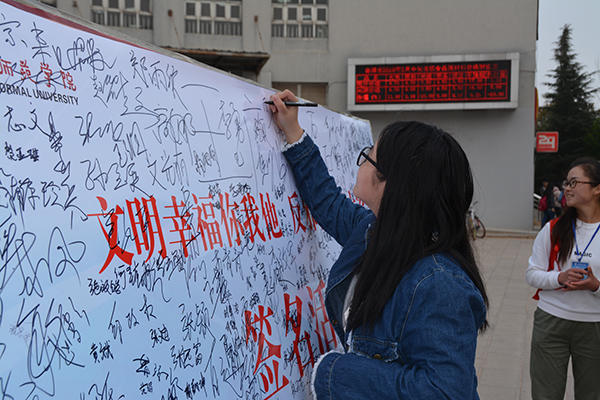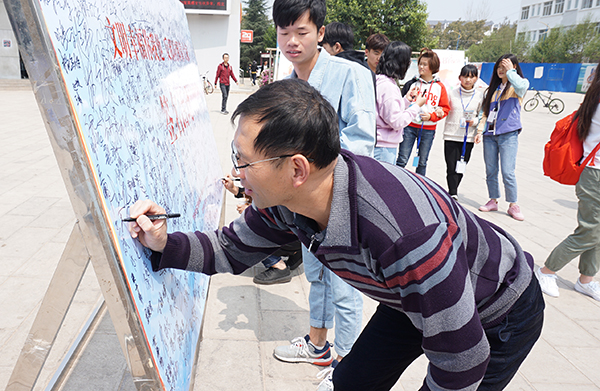 为引导广大师生自觉远离邪教,增强识邪防邪反邪能力,建设“无邪教校园”,3月21日下午,由党委宣传部主办、物理与电子工程学院承办的“文明幸福你我他,反邪防邪靠大家”主题签名活动在学校社区广场举行。