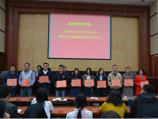 3月23日下午,学校召开2018年宣传信息员暨学生记者播音员培训会,对全校各单位宣传信息员、《曲靖师院报》学生记者、编辑及“校园之声”广播播音员开展专题培训,表彰2017年宣传信息工作先进集体和个人,安排布置2018年宣传信息工作。党委委员、党委宣传部部长钱润光教授作专题培训。