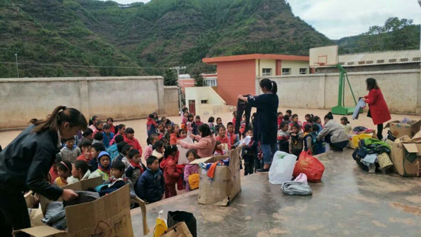 为团山小学的孩子们分发捐赠的衣物