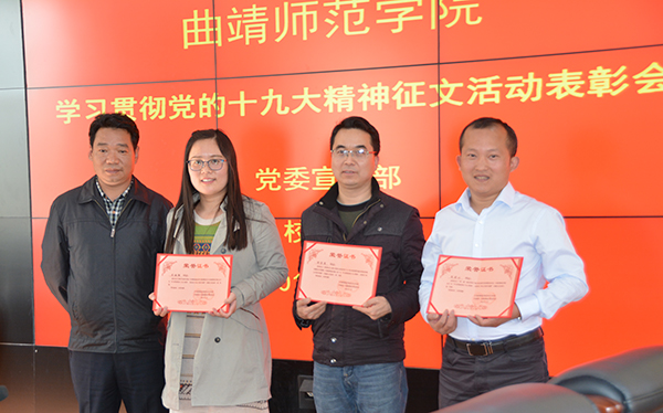 为推动教职工深入学习贯彻党的十九大精神,4月10日下午,bat365对“学习贯彻党的十九大精神”征文获奖集体和个人进行了表彰。学校党委副书记、校工会主席陆选荣出席表彰会并讲话,党委委员、党委宣传部长钱润光宣读获奖名单。校工会副主席杨春亮主持表彰会。