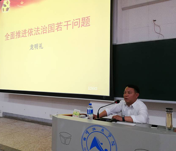 龙明礼从党中央的领导、法律实施、依法行政、公正司法、全民守法、社会治理法治化问题、队伍建设、社会主义核心价值观八个方面,结合实例深入阐述了党的十八届四中全会通过的《中共中央关于全面推进依法治国若干重大问题的决定》精神。龙明礼指出,全面推进依法治国,要在党的领导下,形成完备的法律规范体系、高效的法治实施体系、严密的法治监督体系、有力的法治保障体系,实现科学立法、严格执法、公正司法、全民守法,促进国家治理体系和治理能力现代化。