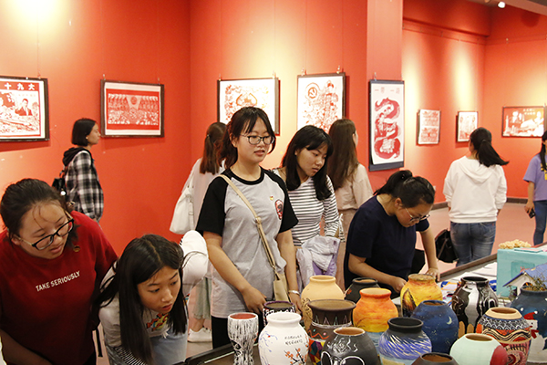 展会上,书法、绘画、剪纸、陶瓷彩绘、手工制作等作品惊艳亮相。绘画作品构图别具匠心,创意与色彩完美融合,细腻生动的描绘了多姿多彩的校园风景;陶瓷彩绘作品婉丽多姿,图案各异,文化气息浓厚,令人陶醉;DIY手工设计作品以绿色、创新为主题,将废旧物品做成精美的手工艺品,既美观又环保实用;普法作品以社会主义核心价值观为内容,充分彰显专业特点;创意剪纸秀作品以十九大精神为主题,弘扬工匠精神。整个展馆里人潮涌动,有的驻足欣赏品味,有的窃语交流,有的拿出手机拍照保存留念,现场师生都沉浸在同学们的创意和才华里。