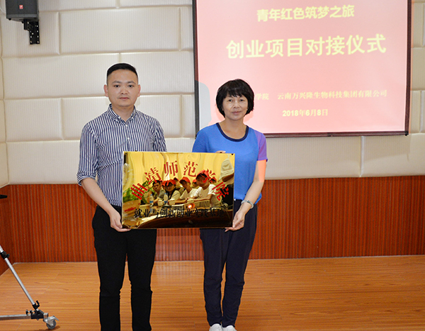 副校长李莉代表学校在下午举行的项目对接仪式上致辞。她希望通过本次活动,结合罗平县推进乡村振兴、精准扶贫需求,借助罗平县丰富的农业产业、旅游产业资源,依托罗平县农业局、万兴隆集团等地方政府部门和龙头企业,推进政府、学校、企业协同,建立产教融合平台,构建创新创业教育校内外联动体系,疏通校政合作、校企合作渠道,建立多方协同共赢模式。并通过对接学校的人才资源优势、科研优势,实现bat365的科研和创新创业成果在罗平县转化落地,助力脱贫。李莉代表学校向云南万兴隆生物科技集团有限公司授予“bat365中文官方网站就业与创新创业实践基地”牌匾,并向公司总经理唐闻兵颁发了“大学生创新创业导师”聘书。