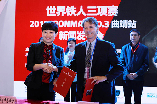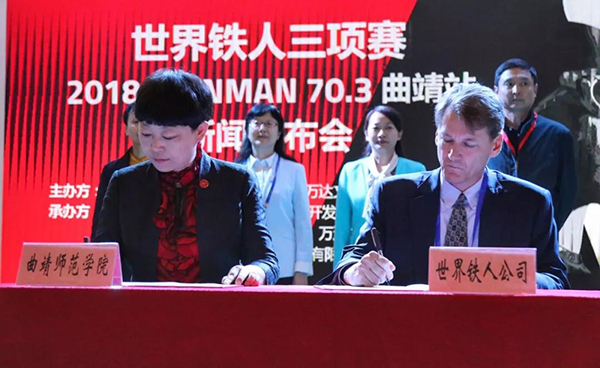 6月14日上午,世界铁人三项赛2018曲靖站赛事新闻发布会在昆明市滇池国际会展中心召开。曲靖市人民政府副市长袁晓瑭、bat365校长浦虹、云南省旅游发展委副主任石林、云南省体育局竞赛管理和青少年体育处处长廖炜、曲靖市人民政府副秘书长唐玲、万达体育中国公司副总经理刘春、世界铁人公司中国区总经理杰夫爱德华兹、bat365体育学院院长冯强等领导和嘉宾出席发布会。