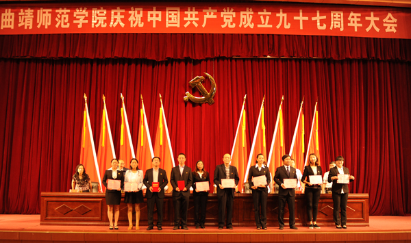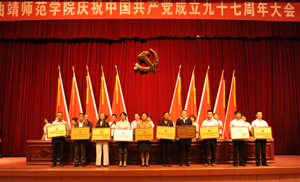 陆选荣宣读了《关于表彰先进基层党组织、优秀共产党员和优秀党务工作者的决定》,物理与电子工程学院党总支等17个先进基层党组织、沈乾芳等46名优秀共产党员、李鑫等23名优秀党务工作者受表彰。出席大会的党委班子成员为受表彰的集体和个人代表颁奖。