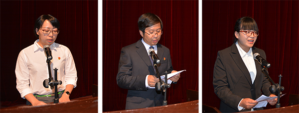 先进基层党组织负责人代表杨锐玲、优秀共产党员教师代表王洪、优秀共产党员学生代表金丽果分别发言。三位师生分别结合自身工作、学习分享体会,表示将严格按照从严治党要求,进一步规范党建工作,在本职岗位上发挥共产党员的先锋模范作用。