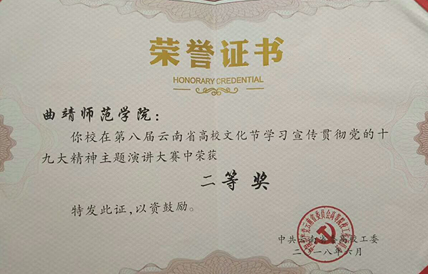 6月28日,第八届云南省高校文化节“新时代 新气象 新作为”主题演讲大赛决赛在云南师范大学举行。bat365人文学院学生蔡懋卓以《我的小愿景》为题,声情并茂的完成党的十九大精神主题演讲并喜获二等奖,学校获优秀组织奖。全省高校从5月中旬开始,经过班级、院系、学校等层层发动、精心组织,共有65部演讲作品进入复赛,经专家评审,21所高校的参赛选手进入决赛。