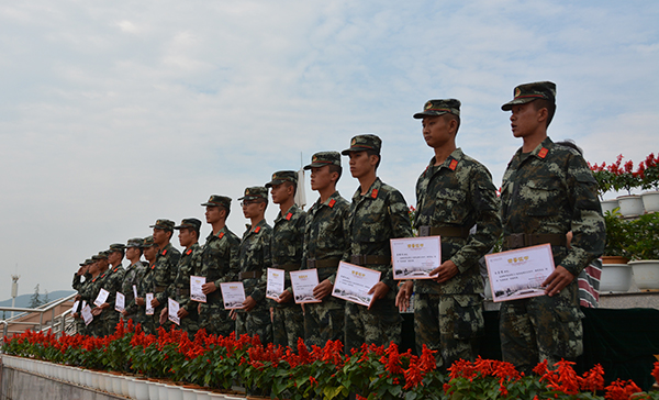 军训结业典礼上,14个学院方队和1个退役大学生方队昂首挺胸走过主席台,向部队首长、学校领导和老师汇报了军训的优异成绩。人文学院等5个学院被表彰为军训“先进学院”,20172101班等10个班级被表彰为军训“先进班集体”,苏娇等143名学生被表彰为军训“优秀学员”,赵伟等20名同志被表彰为“优秀教官”。