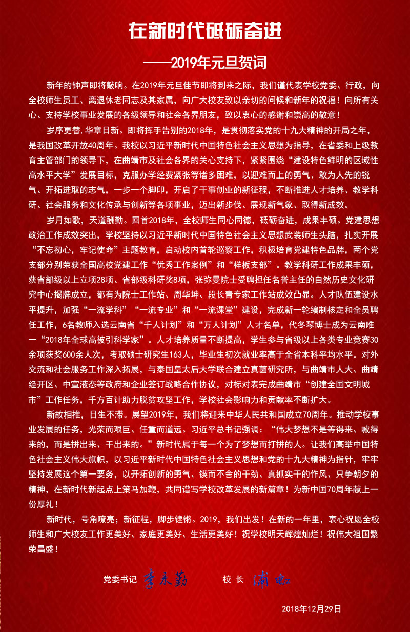 岁序更替,华章日新。即将挥手告别的2018年,是贯彻落实党的十九大精神的开局之年,是我国改革开放40周年。bat365以习近平新时代中国特色社会主义思想为指导,在省委和上级教育主管部门的领导下,在曲靖市及社会各界的关心支持下,紧紧围绕“建设特色鲜明的区域性高水平大学”发展目标,克服办学经费紧张等诸多困难,以迎难而上的勇气、敢为人先的锐气、开拓进取的志气,一步一个脚印,开启了干事创业的新征程,不断推进人才培养、教学科研、社会服务和文化传承与创新等各项事业,迈出新步伐、展现新气象、取得新成效。