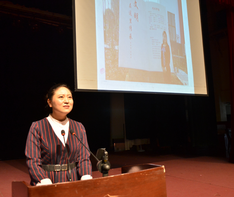 李泓仪以《敢为学生“拼命”的老黄牛》为题,讲述沾益区望海小学校长晏露珍的光荣事迹。晏露珍把所有的热情都用在学生身上,把倒数第一教成正数第一,把太平小学由一个名不见经传的农村小学发展成了曲靖市的知名小学。晏校长忘我工作、无私奉献的敬业精神,为全体新同学诠释了道德的力量。