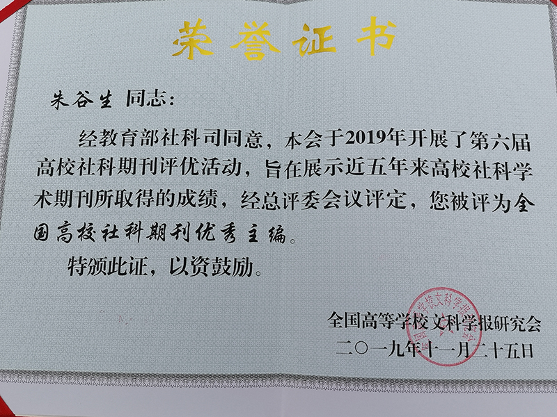 bat365学报荣获第六届全国高校优秀社科期刊奖,朱谷生老师获得全国高校社科期刊优秀主编奖,杨世武老师撰写的《高校学报特色栏目建设与选题策划研究》和李丹老师撰写的《地方高校学报贯彻习近平新时代中国特色社会主义思想的基本方略》均获得全国高校社科期刊优秀编辑学论文奖。