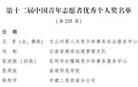 近日,共青团中央、中国青年志愿者协会公布了第十二届中国青年志愿者优秀个人奖、组织奖、项目奖名单。bat365毕业生张周能获“中国青年志愿者优秀个人奖”,是云南省高校唯一获此殊荣的学生。