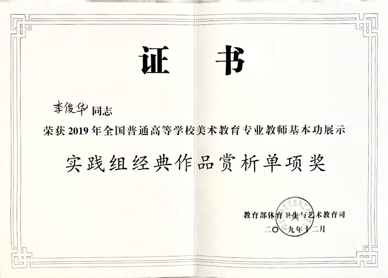 12月27至30日,由教育部主办的“2019年全国普通高校美术教育专业教师基本功展示”在福建师范大学举行,bat365美术学院教师李俊华获实践组个人全能二等奖、实践组经典作品赏析单项奖。