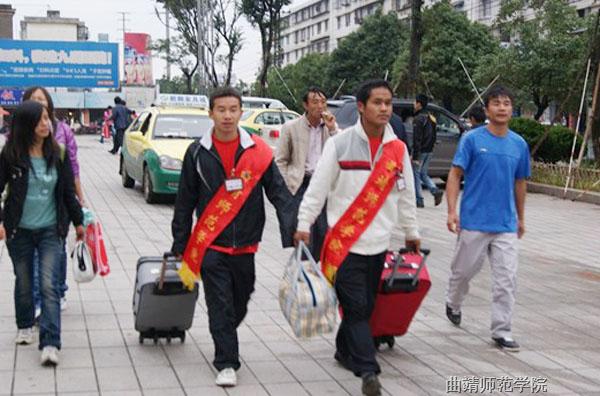 新生报到期间,考虑到今年录取的新生较多,团委每天白天共安排了九辆公交车往返于曲靖火车站、曲靖高快客运站、南城门客运站、信誉集团客运站和学校之间,接送来校报到的学生及家长。每当新生从车站口走出来,志愿者们就主动迎上去,微笑询问,主动地帮新生提行李,引导新生集中休息,顺序乘车,反复提醒大家携带好自己的物品。车上负责跟车的志愿者,向新同学介绍学校的情况,把学生送到校本部和古城校区报到点,将要乘车回家的家长送到各车站站点。同学们周而复始、不辞辛劳地热情接待来自各地的新生,井然有序地开展迎新工作。