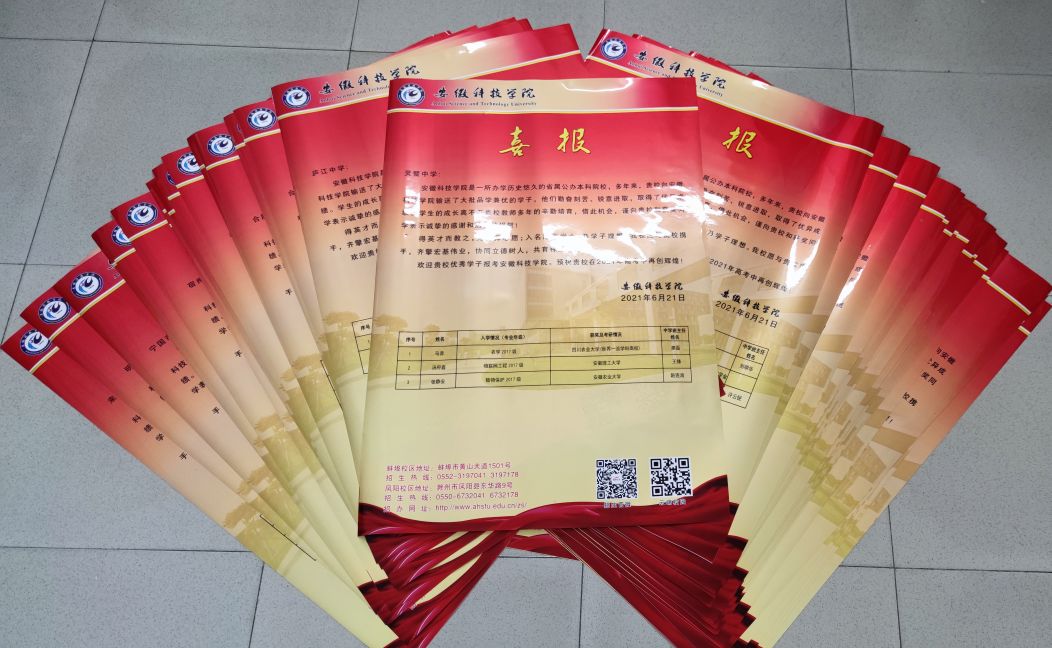 今年喜报的寄发范围为2018—2019年度和2019—2020年度国家奖学金、国家励志奖学金的获得者、2021届安徽省普通高等学校优秀毕业生和2021年毕业考取硕士研究生情况。共计发往192所高中1588人次榜上有名。所有喜报于6月23日顺利寄出。
