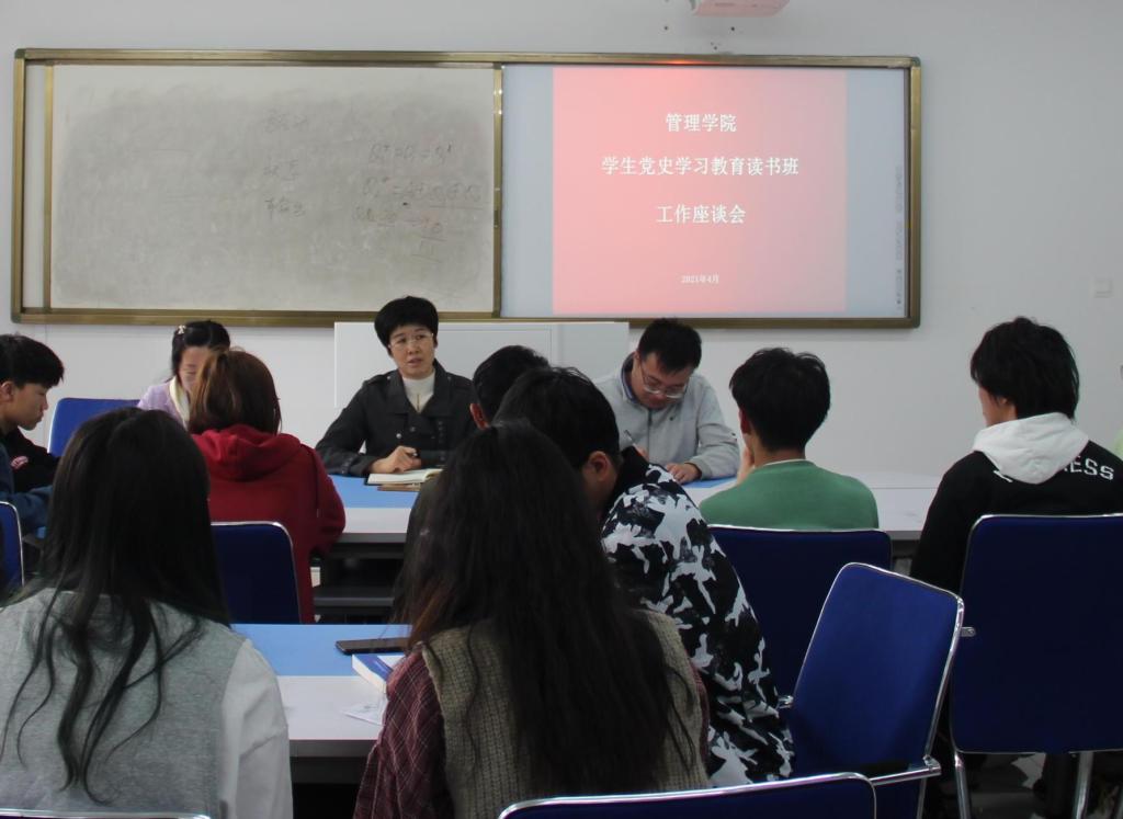 4月29日中午,管理学院在龙湖校区致知楼B智慧教室召开学生党史学习教育读书班座谈会,院党委副书记陶漫,团委副书记方辛,专职辅导员江旭聪出席座谈会。座谈会由江旭聪主持。