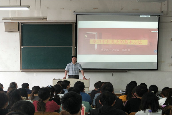 杨仕勇以《学习中共党史的基本方法》为题,从“学习党史的目的要求”“ 学习党史存在的主要误区”“ 如何以正确的立场评价历史”等三个方面详细讲述,既有对习近平总书记关于党史学习重要论述的介绍,也有党史学习过程中存在问题事例的剖析,更有如何鉴别党史内容真伪方法的传授。他强调,学习党史要坚持正确的人民立场,全面地、整体地把握党史,通过现象把握本质,具体地、历史地考察党史。他指出,学好党史这门“必修课”,就是要增强历史定力,在历史学习中提高历史思维能力,善于运用历史眼光谋划工作,以史为鉴推进本职工作。整场党课主题鲜明,逻辑严密,资料详实,语言幽默,饱含激情,让现场听课的党员对党史学习内容的把握有了更深刻的认识。课后,师生党员纷纷表示受益匪浅、深受教育。
