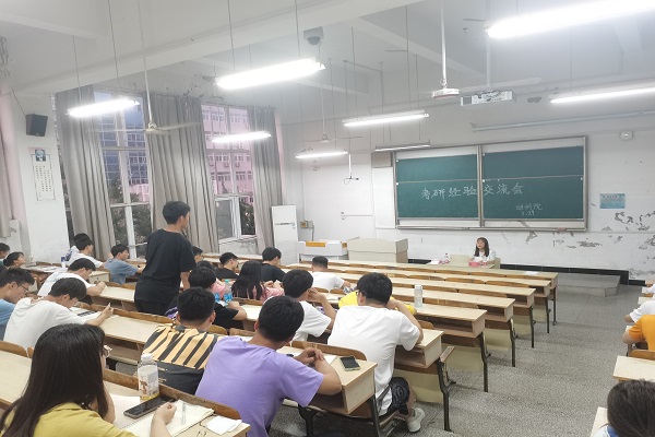 交流会共分为两个环节。一是经验分享,二是互动环节。裴芬等人围绕着择校、查询备考资料、复习计划等方面分享了自身的经历,就整个过程的注意事项向学弟学妹们做了提醒,并强调了学好专业课、在大一大二阶段通过活动参与提升自身综合能力与素养的重要性。互动环节中,在场的学生就院校及专业的选择、自己的心理焦虑、时间分配等问题进行讨论与交流。