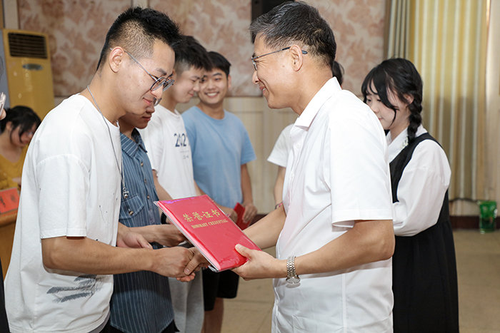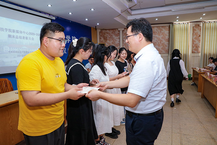 会上,卫胜、黄立义、姚文均分别为新媒体中心2021届毕业生代表、获评2020-2021学年“新媒体中心先进工作者”称号的优秀个人颁发荣誉证书。
